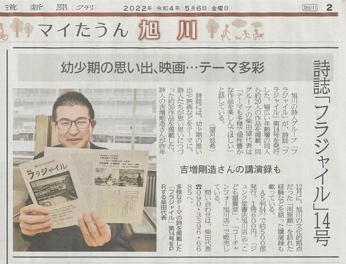 ■5月6日(金)の北海道新聞夕刊《マイたうん旭川》に、「詩誌「フラジャイル」第14号~吉増剛造さんの講演も~」と、大きくご紹介戴いております。誠にありがとうございます。「詩人の吉増剛造さんが昨年12月に、旭川の文化拠点だった河原館を訪ねた経験など…